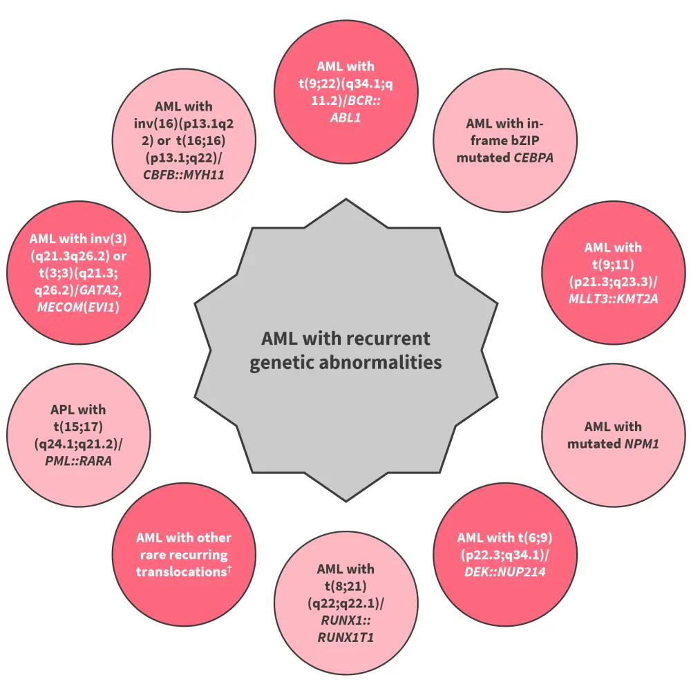 †Other rare recurring translocations include AML with t(1;3)(p36.3;q21.3)/PRDM16::RPN1, AML (megakaryoblastic) with t(1;22)(p13.3;q13.1)/RBM15::MRTF1, AML with t(3;5)(q25.3;q35.1)/NPM1::MLF1, AML with t(5;11)(q35.2;p15.4)/NUP98::NSD1, AML with t(7;12)(q36.3;p13.2)/ETV6::MNX1, AML with t(8;16)(p11.2;p13.3)/KAT6A::CREBBP, AML with t(10;11)(p12.3;q14.2)/PICALM::MLLT10, AML with t(11;12)(p15.4;p13.3)/NUP98::KMD5A, AML with NUP98 and other partners. AML with t(16;21)(p11.2;q22.2)/FUS::ERG, AML with t(16;21)(q24.3;q22.1)/RUNX1::CBFA2T3, and AML with inv(16)(p13.3q24.3)/CBFA2T3::GLIS2