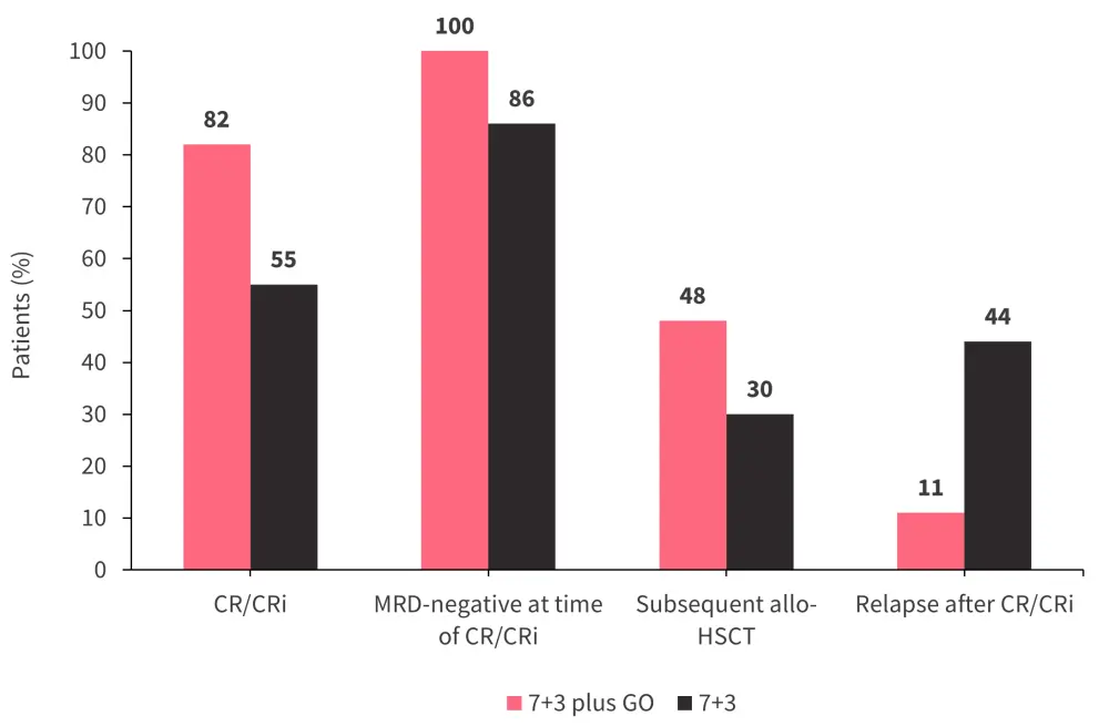 Allo-HSCT, allogeneic hematopoietic stem cell transplantation; CR, complete remission; CRh, CR with partial hematologic recovery; CRi, CR with incomplete hematologic recovery; GO, gemtuzumab ozogamicin |