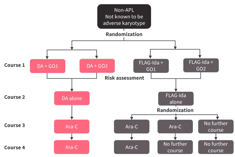 APL, acute promyelocytic leukemai; Ara-C, cytarabine; DA, daunorubicin and cytarabine; FLAG-Ida, fludarabine, cytarabine, granulocyte-colony stimulating factor, and idarubicin; GO1; gemtuzumab ozogamicin single dose; GO2, gemtuzumab ozogamicin fractionated dose.