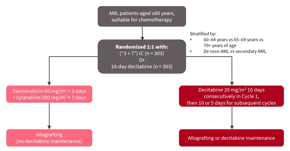 Both treatment arms recorded similar OS and HSCT rates. However, patients aged ≥70 years had a longer OS with decitabine, while younger patients (aged 60–64 years), or those with NPM1 mutations, had a longer OS with the “3 + 7” IC regimen. In terms of response rate, decitabine recorded a lower CR/CRi rate versus the “3 + 7” regimen; however, the safety profile and health economics profile were more favorable. The overall transplant rates (both on- and off-protocol) were >50% in both arms.