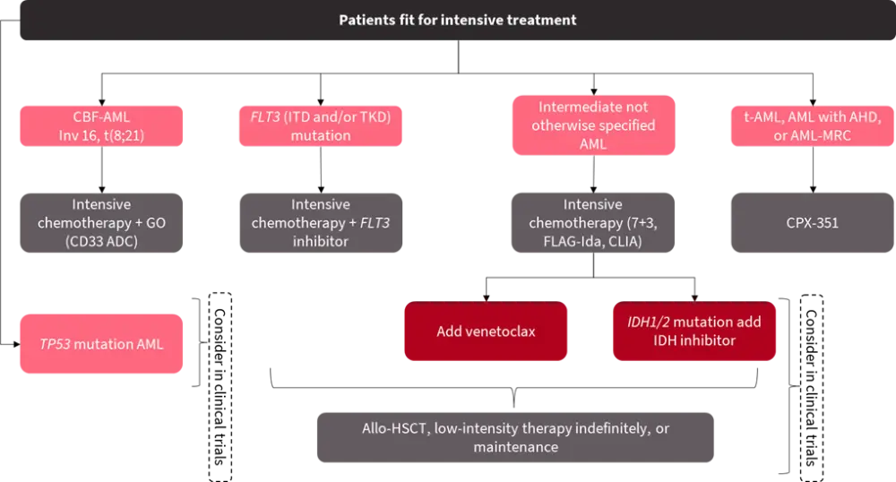 ADC, antibody drug conjugate; AHD, antecedent hematological disorder; allo-HSCT, allogeneic hematopoietic stem cell transplantation; AML, acute myeloid leukemia; CBF, core binding factor; CLIA, cladribine, idarubicin, cytarabine; FLAG-Ida, fludarabine, cytarabine, granulocyte-colony stimulating factor and idarubicin; GO, gemtuzumab ozogamicin; ITD, internal tandem duplication; MRC, myelodysplasia-related changes; t-AML, therapy-related AML; TKD, tyrosine kinase domain.