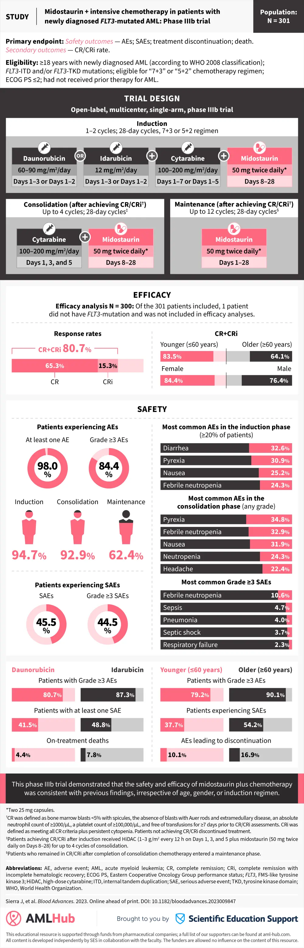 The AML Hub is pleased to present a visual abstract summarizing the efficacy and safety outcomes from a phase IIIb trial (NCT03379727) of midostaurin plus idarubicin or daunorubicin in young (≤60 years) and older (≥60 years) patients with newly diagnosed FLT3-mutated AML.1