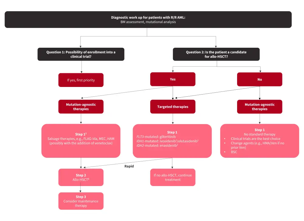 Allo-HSCT, allogeneic hematopoietic stem cell transplantation; AML, acute myeloid leukemia; BM, bone marrow; BSC, best supportive care; FLAG-Ida, fludarabine, cytarabine, granulocyte colony-stimulating factor, and idarubicin; HAM, high-dose cytarabine, mitoxantrone; HMA, hypomethylating agent; MEC, mitoxantrone, etoposide, cytarabine; R/R, relapsed/refractory; Ven, venetoclax.