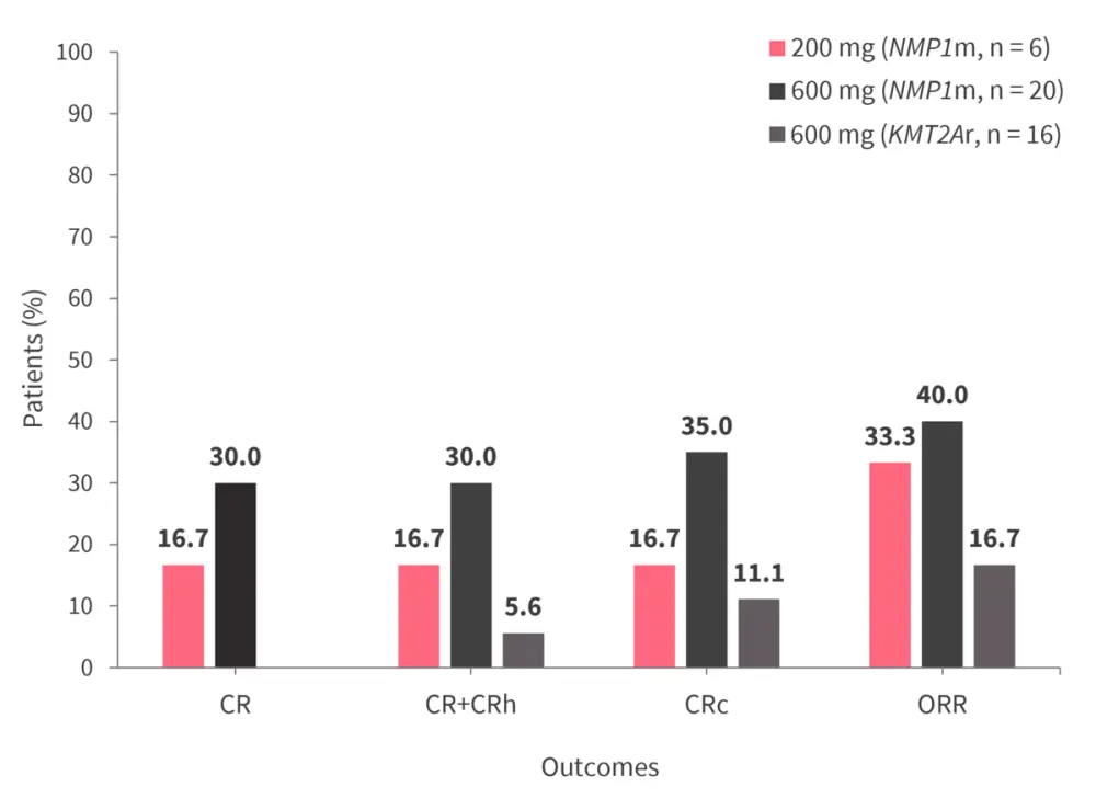 CR, complete remission; CRc, composite complete remission; CRh, complete remission with partial hematologic; KMT2Ar, KMT2A rearrangement; NPM1m, NPM1 mutation; ORR, overall response rate.