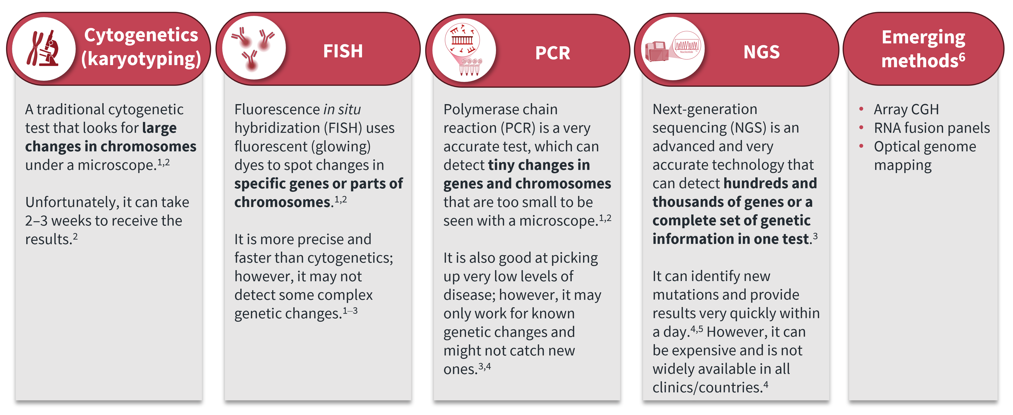 Several mutation testing methods are available, including conventional cytogenetics (karyotyping), fluorescence in situ hybridization (FISH), polymerase chain reaction (PCR), and next-generation sequencing (NGS), and these techniques continue to evolve (Figure 1).