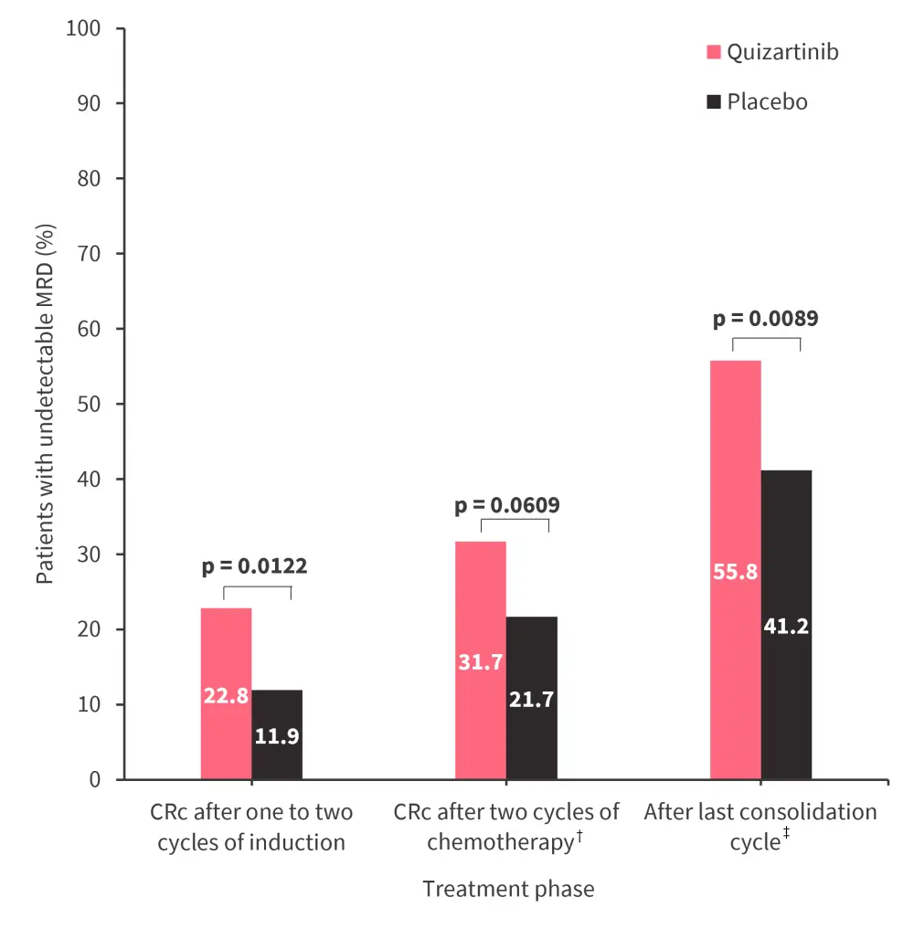 In this analysis, FLT3-ITD measurable residual disease (MRD) was assessed using a specifically designed polymerase chain reaction-next-generation sequencing assay. Of the 368 patients who achieved a composite complete remission (CRc), 321 had MRD data available (quizartinib arm, n = 162; placebo arm, n = 159).