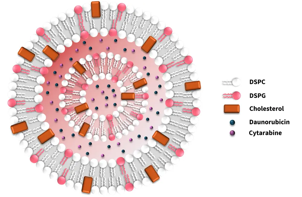The first liposomal products, such as those for daunorubicin or doxorubicin hydrochloride, were formulated with high cholesterol and encapsulated only a single agent.5 While these single-agent formulations had distinct pharmacokinetic profiles, the required fixed synergistic ratio could not be retained when administration was combined and manipulation of the liposomal composition was required to maintain a synergistic molar ratio for extended periods in vivo.5 To address this, CPX-351, a dual-drug low-cholesterol liposomal encapsulation of daunorubicin and cytarabine, was rationally designed.5