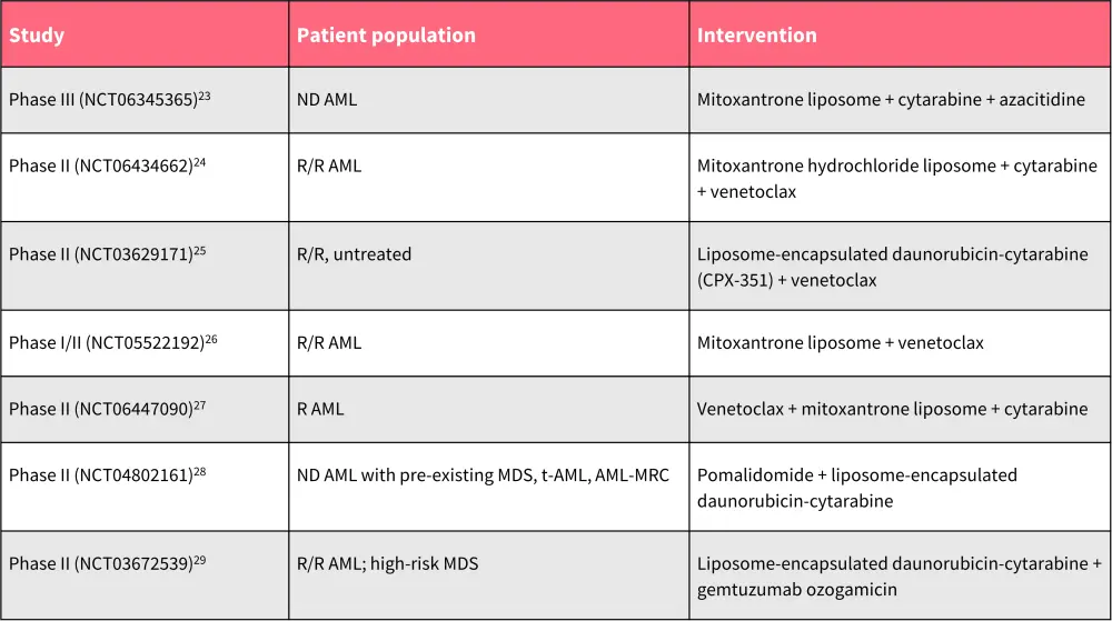 Table 4 provides a list of additional ongoing trials assessing liposomal drug delivery systems for AML.