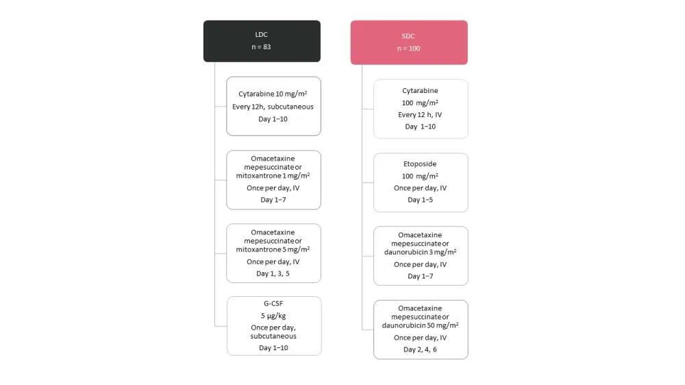 G-CSF, granulocyte-colony stimulating factor; IV, intravenous; LDC, low-dose chemotherapy; SDC, standard-dose chemotherapy.