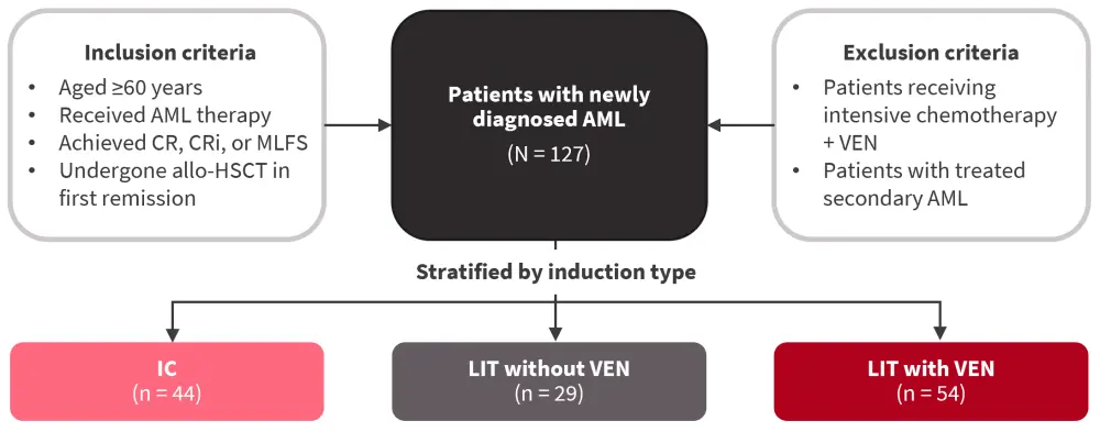 allo-HSCT, allogeneic hematopoietic stem cell transplantation; AML, acute myeloid leukemia; CR, complete remission; CRi, CR with incomplete recovery; IC, intensive chemotherapy; LIT, lower intensity therapy; MLFS, morphologic leukemia-free state; VEN, venetoclax.