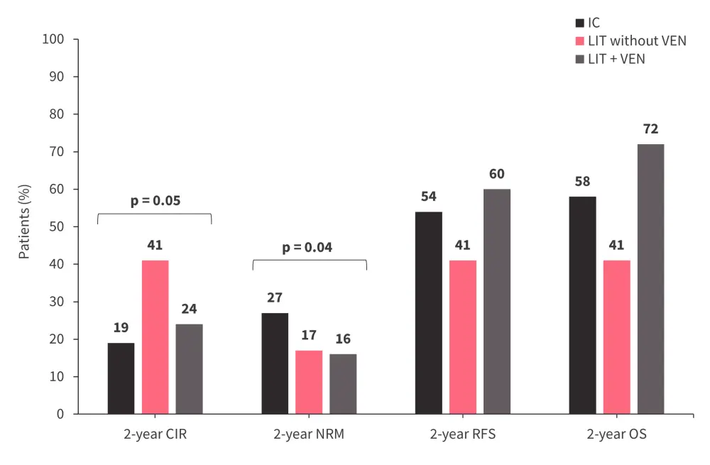 CIR, cumulative incidence of relapse; IC, intensive chemotherapy; LIT, lower-intensity therapy; NRM, non-relapse mortality; OS, overall survival; RFS, relapse-free survival; VEN, venetoclax.