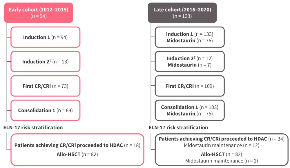 allo-HSCT, allogeneic hematopoietic stem cell transplantation; CR, complete remission; CRi, complete remission without hematologic recovery; ELN-17, European LeukemiaNet 2017; HDAC, high dose cytarabine.