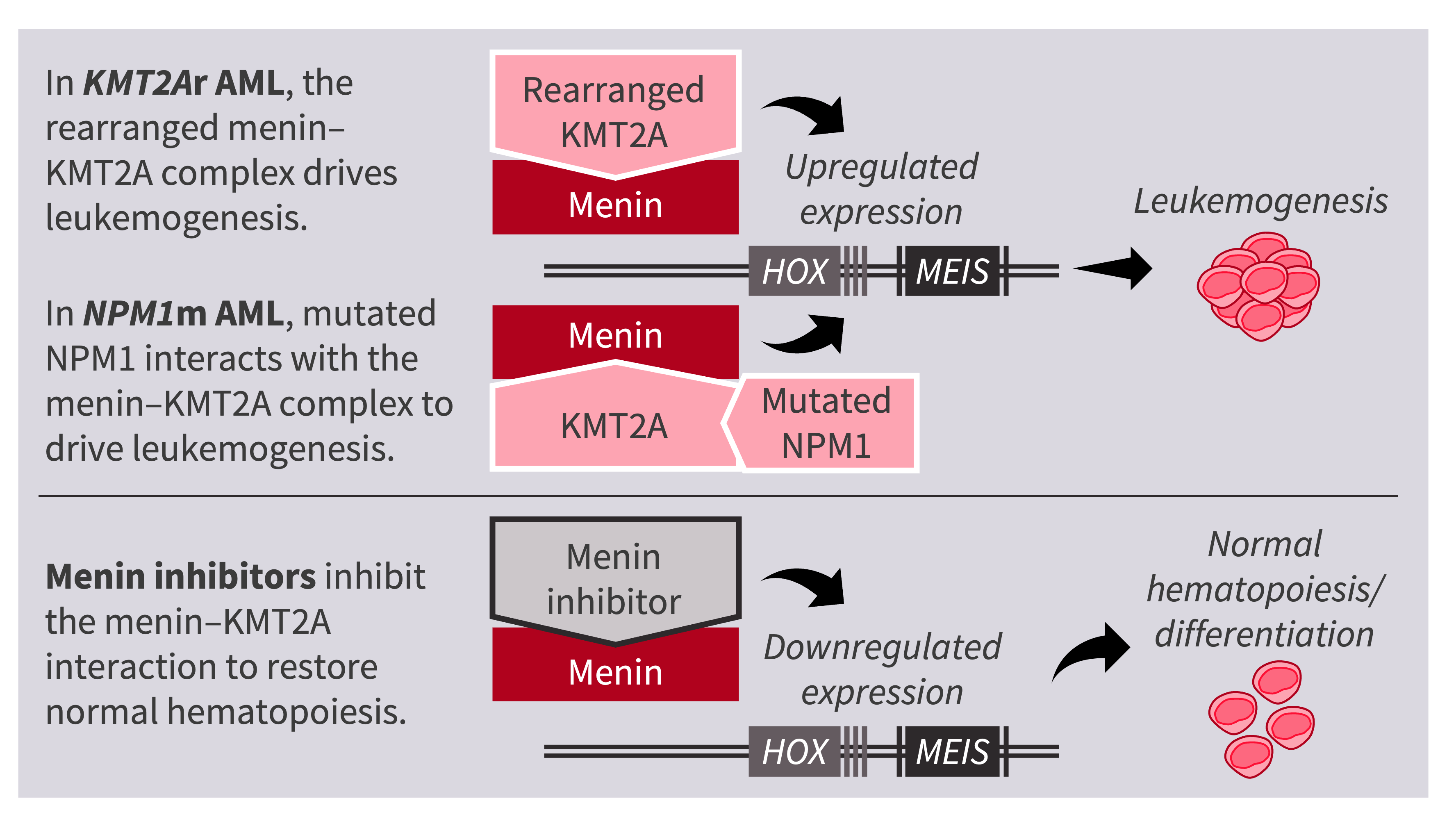 In nonleukemic cells, the KMT2A protein and menin interact to regulate HOX/MEIS gene transcription and maintain normal hematopoiesis. In KMT2Ar and NPM1m AML, the abnormal complex of rearranged KMT2A protein and menin, or an abnormal interaction between mutated NPM1 protein and the menin–KMT2A complex, results in upregulated expression of HOX and MEIS, which in turn drives leukemogenesis.1,2 Thus, the menin–KMT2Ar complex is a promising therapeutic target in AML; menin inhibitors act on the menin–KMT2A complex, resulting in downregulated expression of HOX and MEIS, and restoration of normal hematopoiesis (Figure 1).1,2