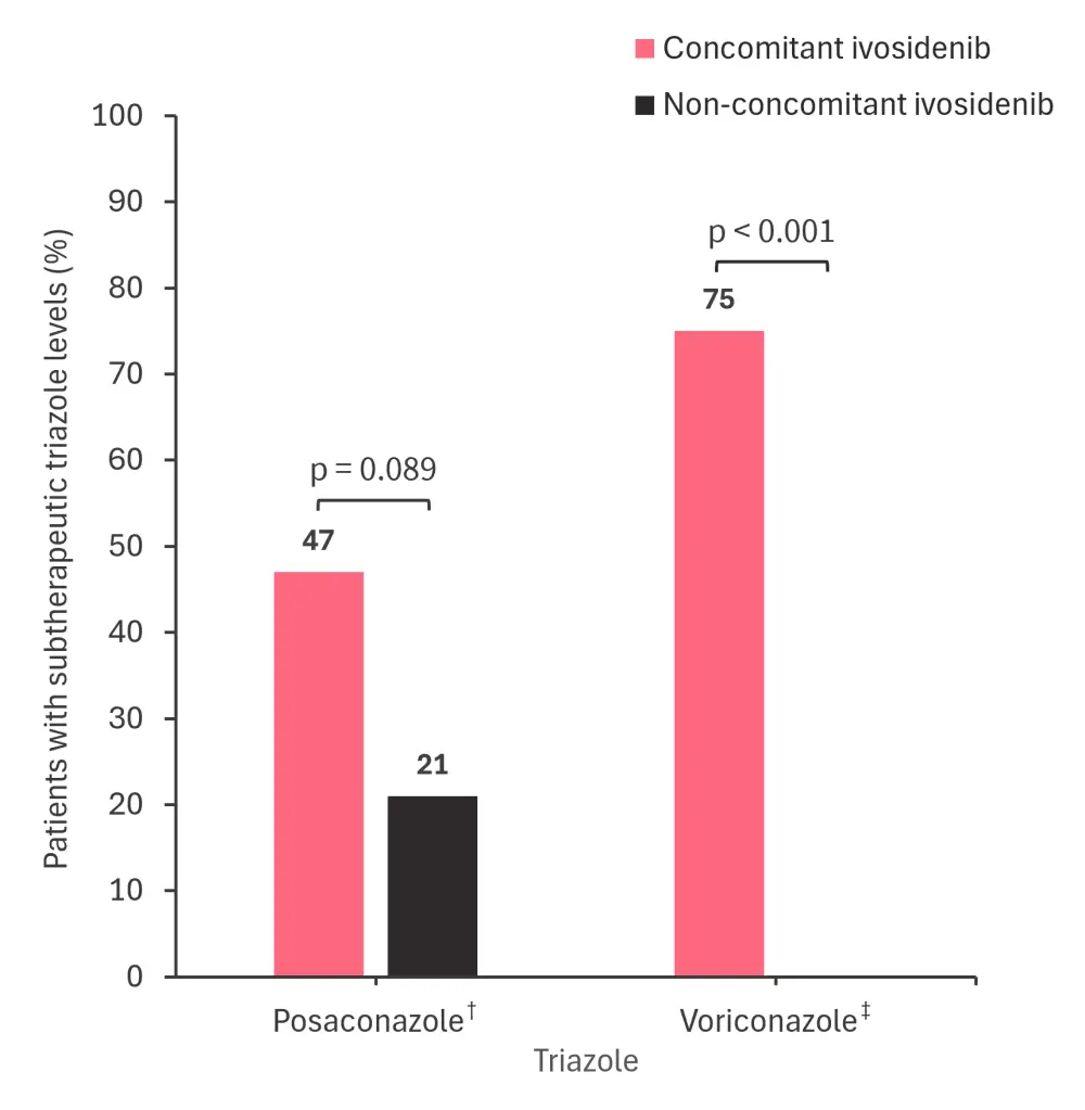 Recently, Dinh et al.1 reported on the incidence of subtherapeutic triazole levels in patients with AML or myelodysplastic syndromes treated with concomitant ivosidenib in Cancer. We summarize the findings below.