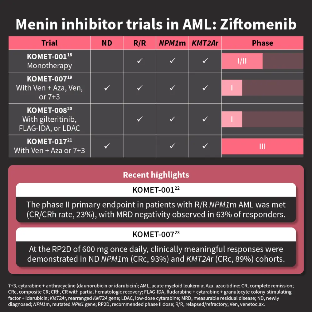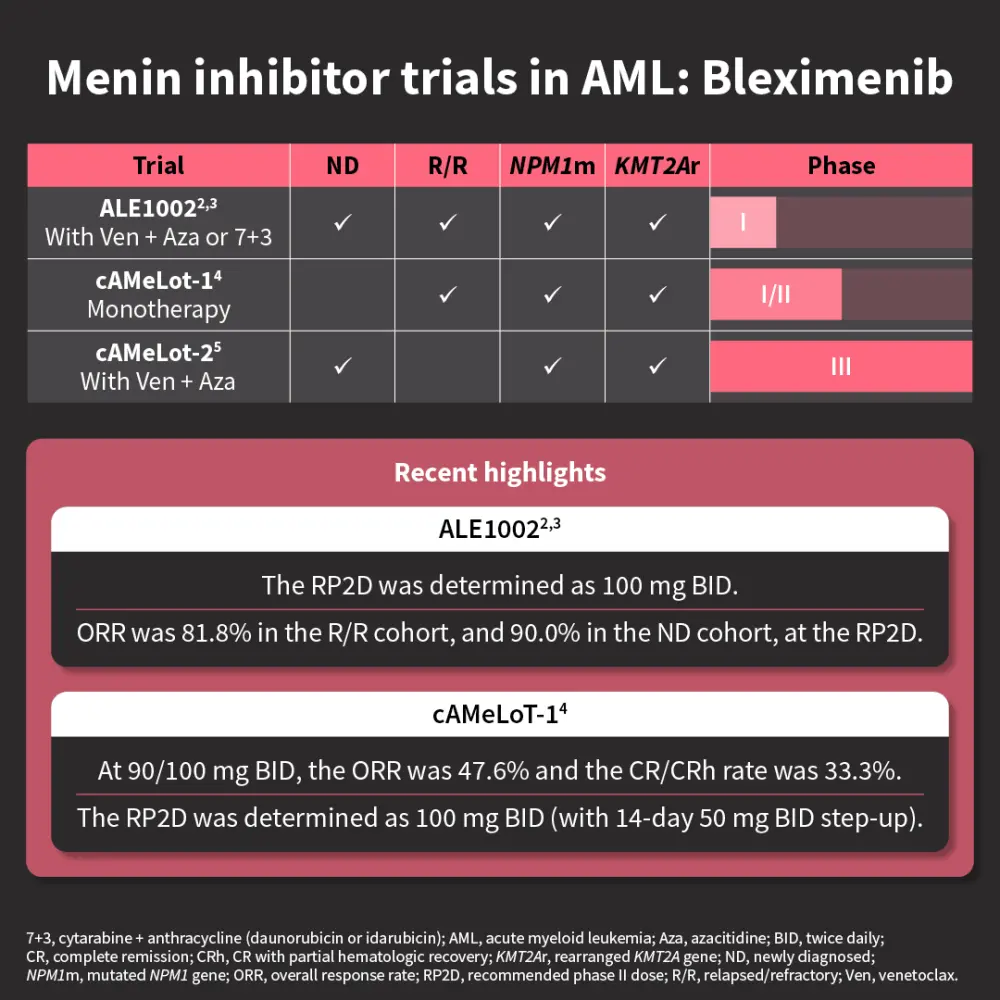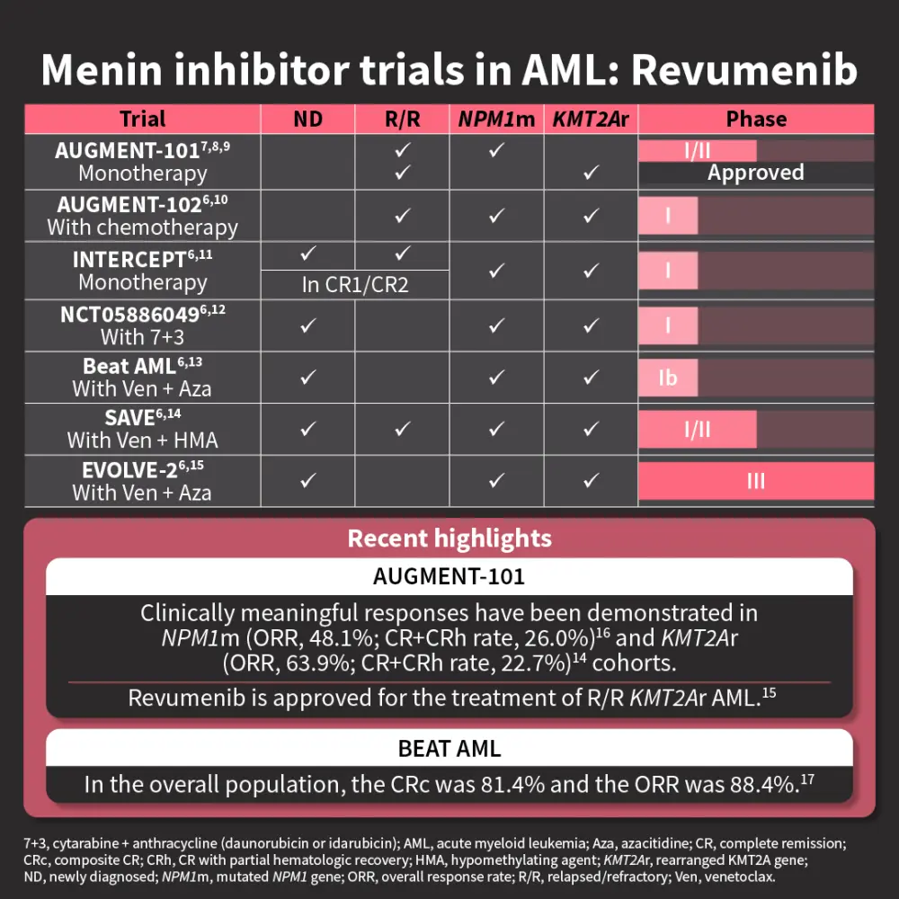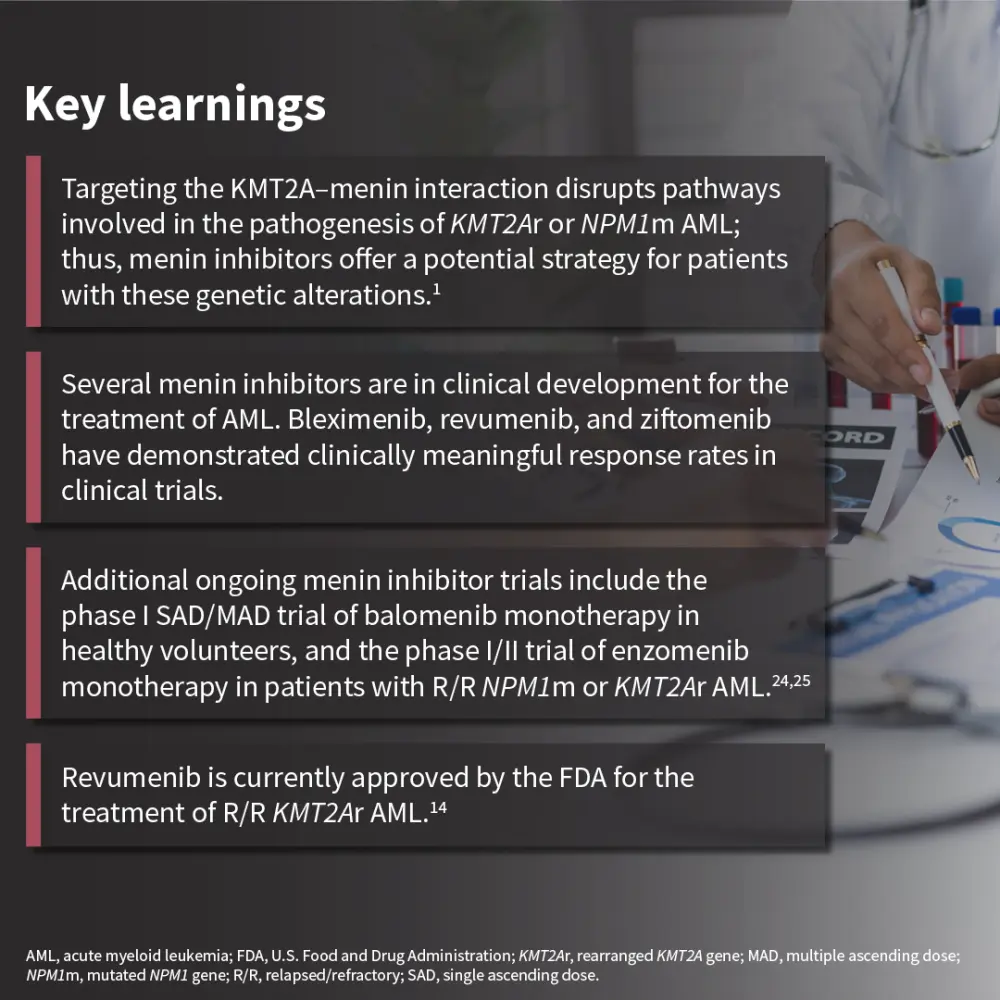 We explore the role of menin in acute myeloid leukemia pathogenesis and review the latest clinical trial data of menin inhibitors, which demonstrate clinically meaningful responses in acute myeloid leukemia.